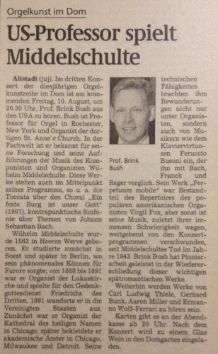 " Brink Bush made a superb presentation to our graduate students on the music of Wilhelm Middelschulte. He has immersed himself in this heretofore unexplored area so thoroughly that he has a vast store of information "on top of his head". Anyone who might assume that Middelschulte is only a peripheral figure among late-Romantics will be amazed at what he created. Brink Bush's lecture was, very honestly, a revelation and his finely produced hand-outs a highly valuable reference. "